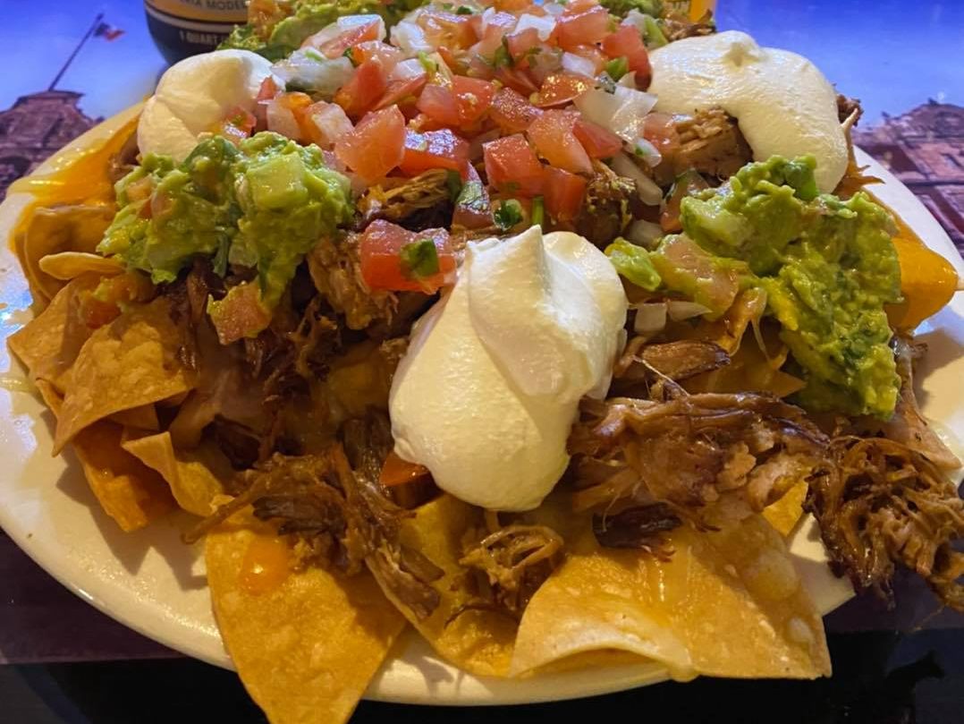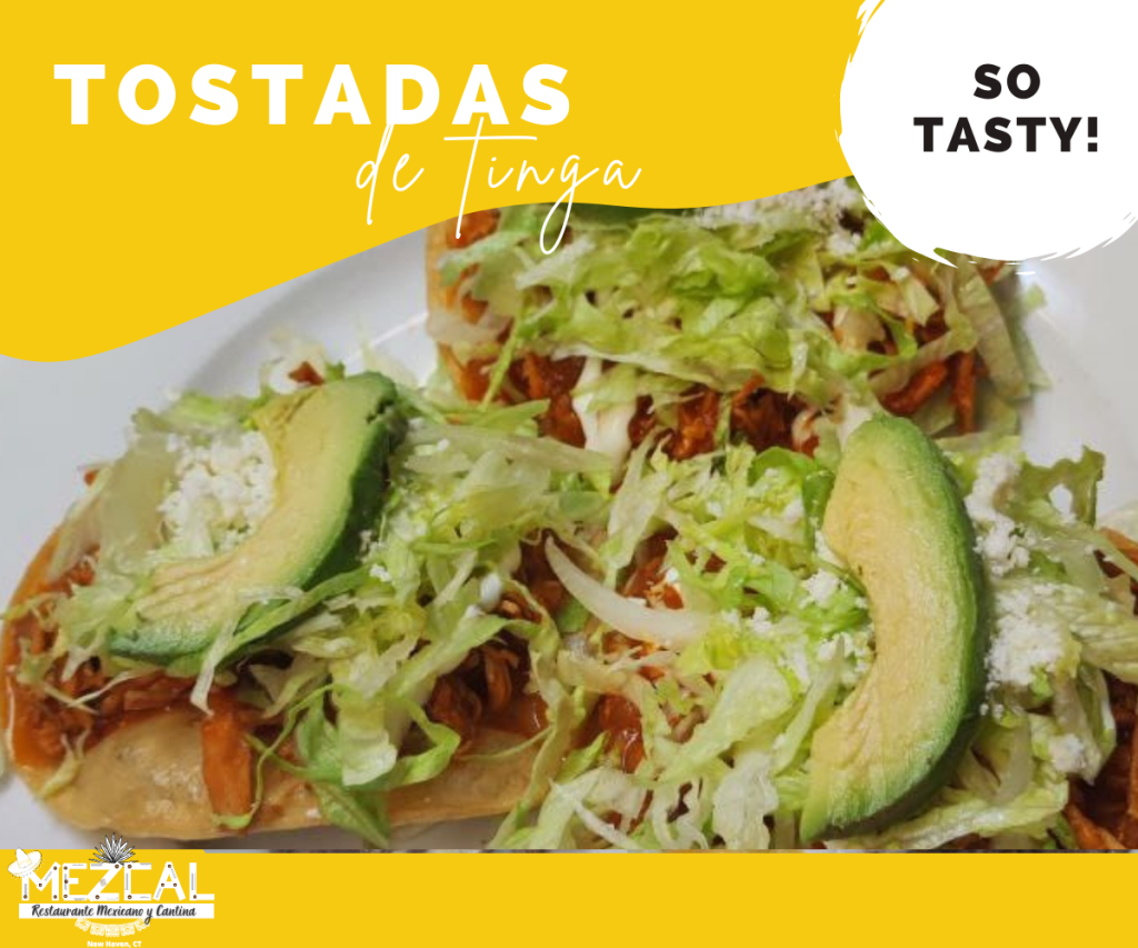 Shredded chicken simmered in chipotle sauce served on three crispy tortillas with refried beans, sour cream, lettuce and topped with crumbled cheese and avocado, ¡Ay caramba!