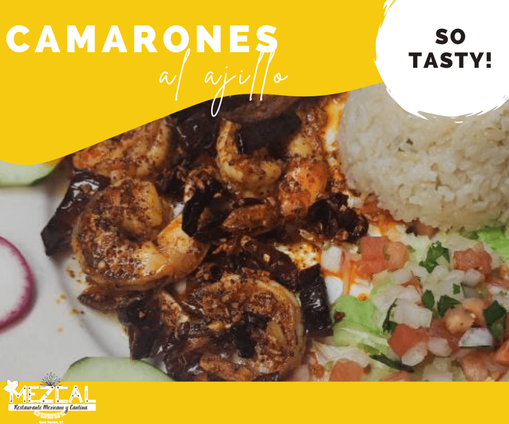 Shrimp sautéed and simmered in a spicy sauce (hot as an inferno!) served with white rice, lettuce, tomato, sliced avocado, fried plantains and tortillas.